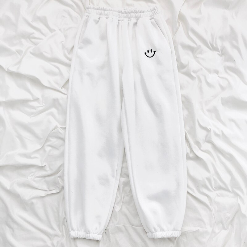 Lightweight fleece sweatpants with a simple cute smiley face on the pocket, perfect for lounging around the house in, or pair together with sneakers and your favourite top for an easy, comfy outfit.