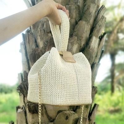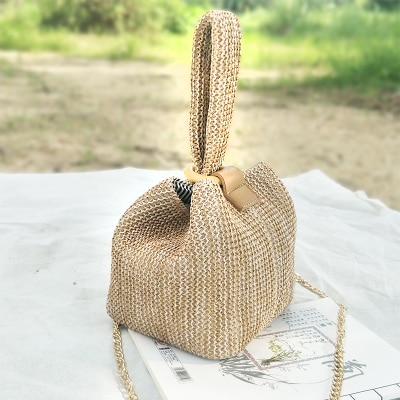 This exquisite handbag effortlessly blends natural elegance with a touch of modern style. Crafted with meticulous attention to detail, its straw weave design showcases the beauty of traditional craftsmanship. The bag's unique pouch shape adds a contemporary edge, while the inclusion of a gold shoulder chain allows for versatile styling options.