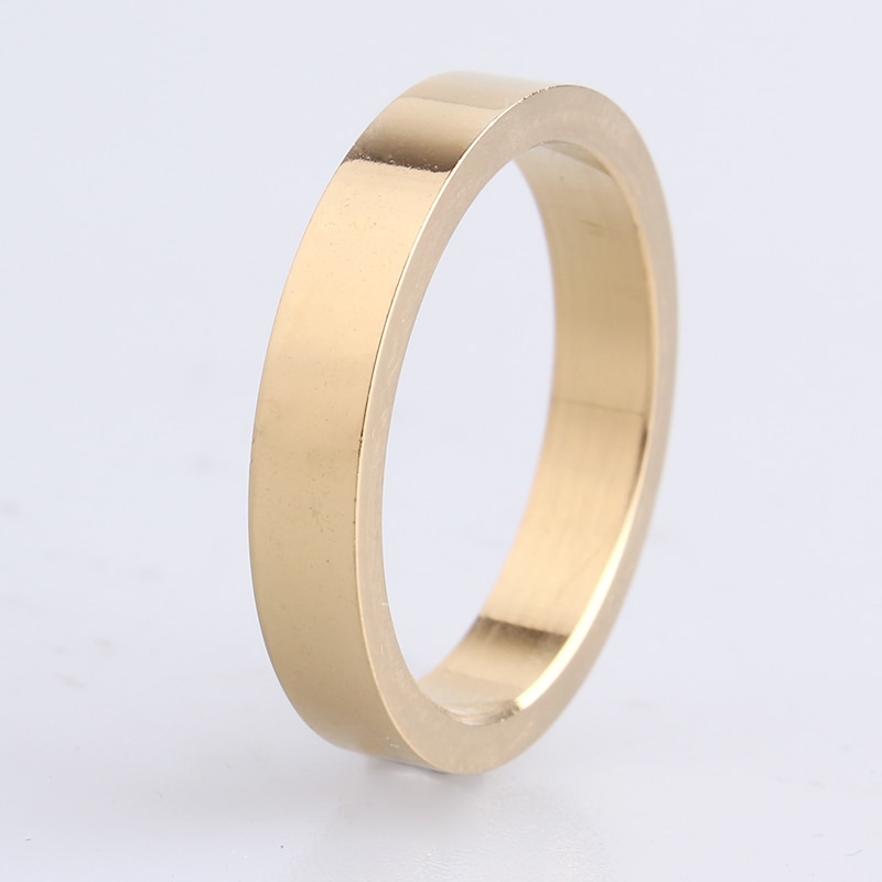 This gold ring is the epitome of classic elegance. With a thick 4mm band width, it is sure to make a statement on any finger. Crafted from high-quality stainless steel, this ring is built to last. Its simple yet timeless design makes it the perfect choice for a wedding band or a stylish accessory to complement any outfit. Add a touch of luxury to your jewelry collection with this beautiful gold ring.