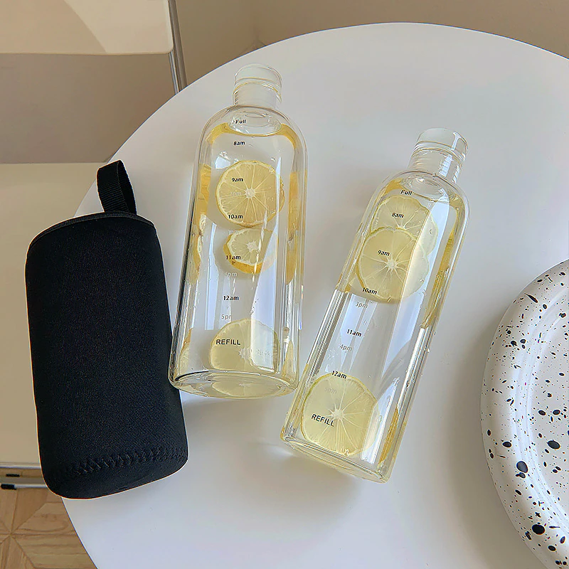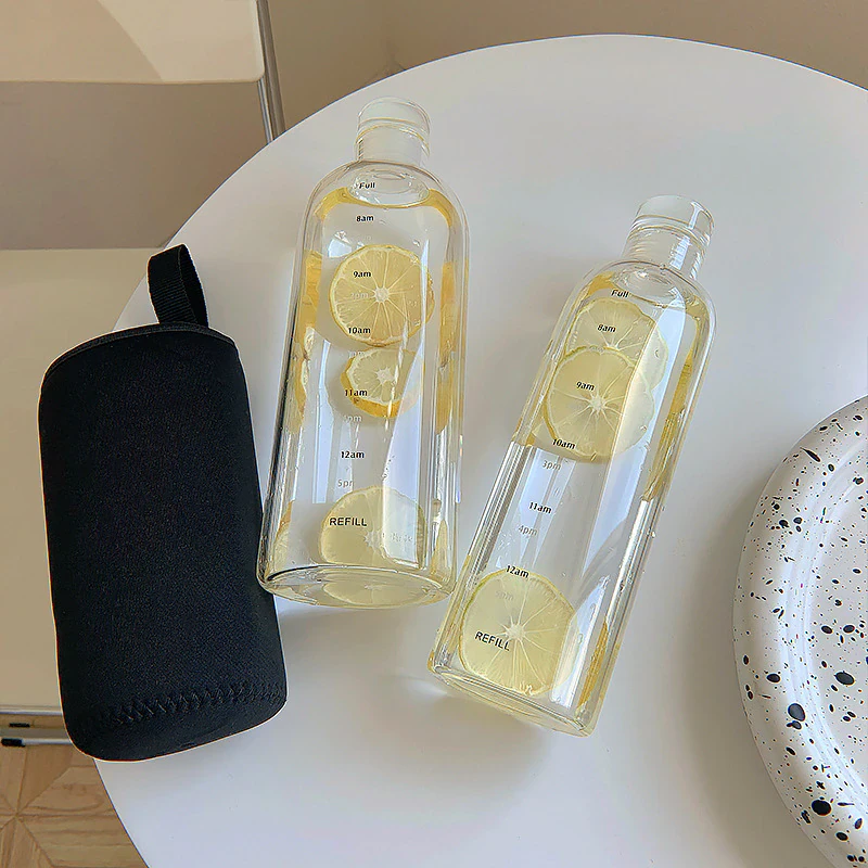 Keep track of your daily water intake with this glass drink bottle. It features a time scale printed down the side so you can hit those hydration goals, and a leak proof lid so you can pop it in your bag and take it on the go.