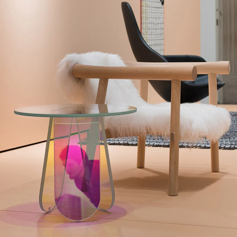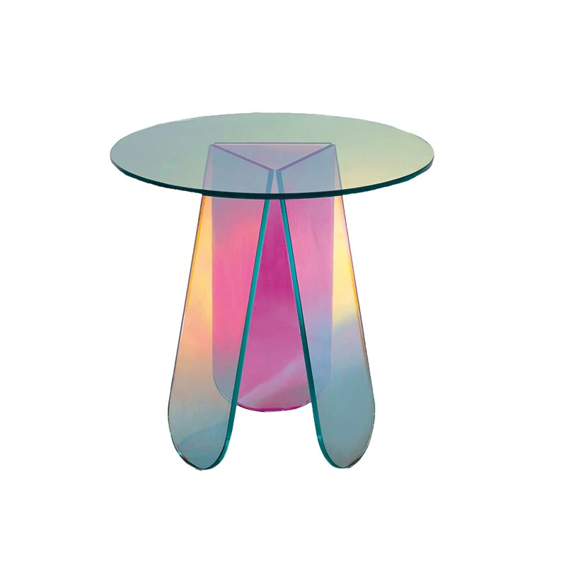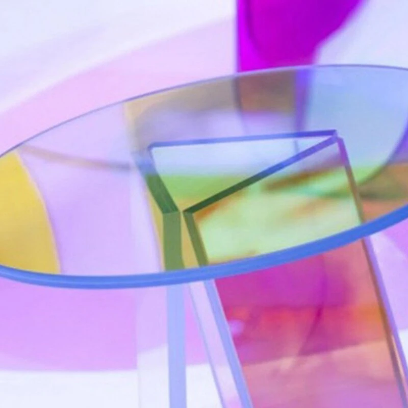 This iridescent coffee table is made of a trendy clear acrylic and is a unique piece to add to your space.It has rounded legs and is a great accent piece to add to your living space, sitting room or even as a nightstand. Available in a smaller side table size anda larger coffee table size.