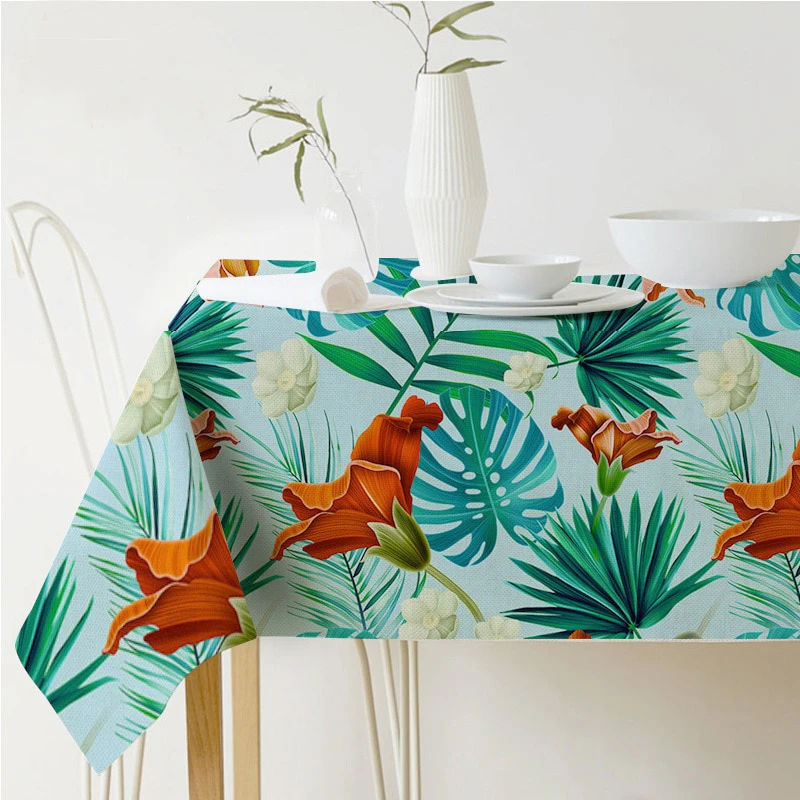 Bring the beauty of the tropics to your dining room with this linen blend tropical print table cloth. Choose from a range of stunning prints that will transport you to a lush paradise. Perfect for adding a pop of color to your home, this table cloth is available in multiple sizes to fit any table.