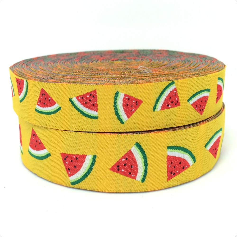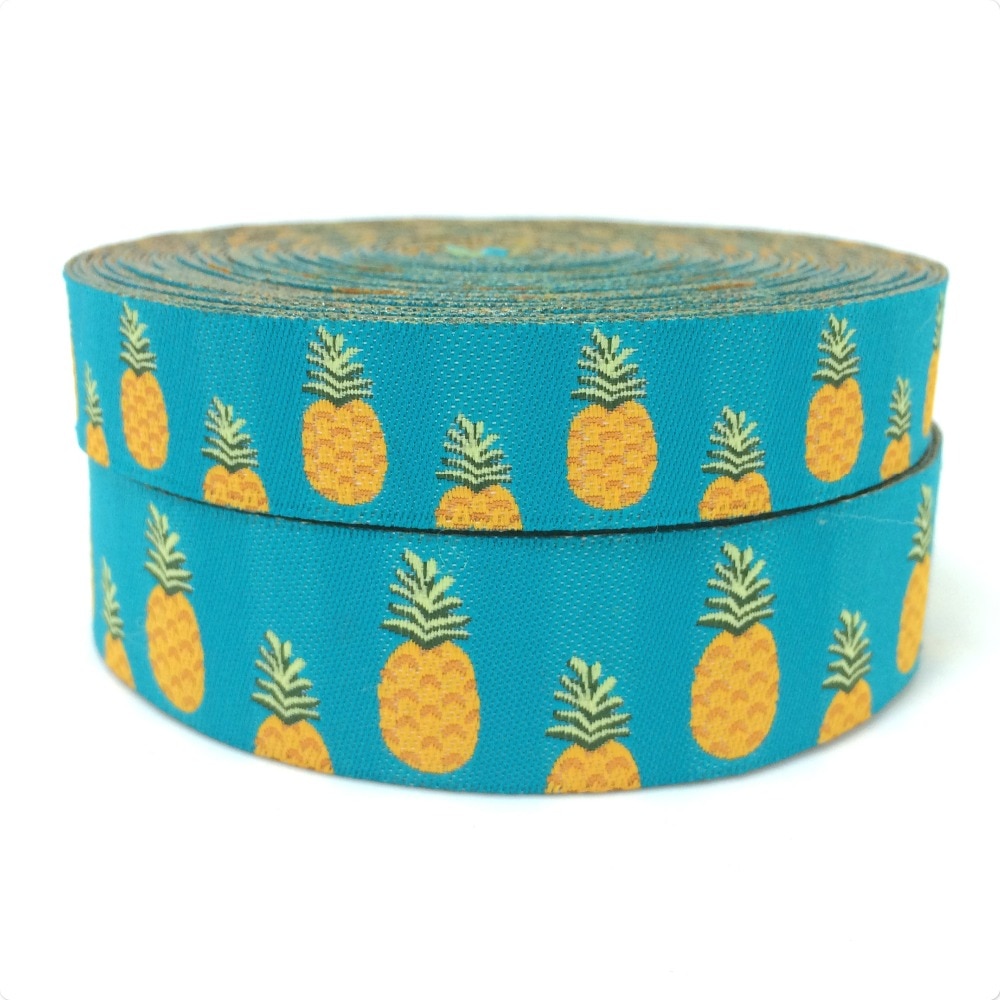 Add a pop of tropical fun to any project with this woven jacquard tropical ribbon. Choose from the vibrant yellow watermelon or playful blue pineapple designs to add a touch of summer to your DIY projects. Whether you're creating custom apparel or unique home decor, this ribbon is sure to make a statement.