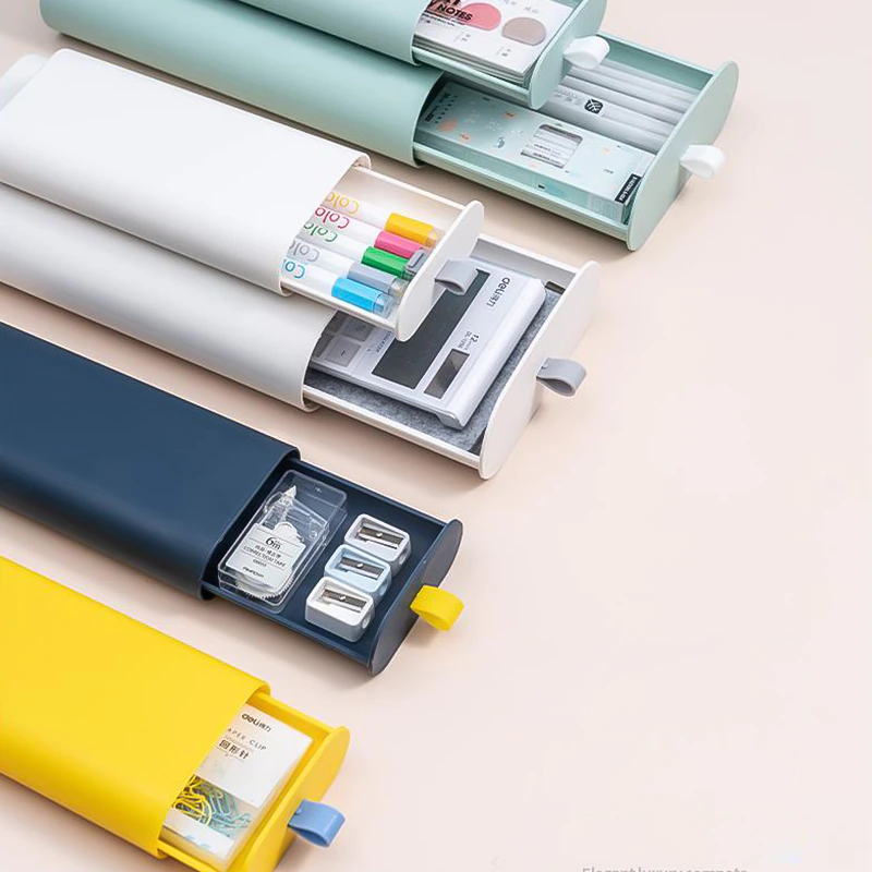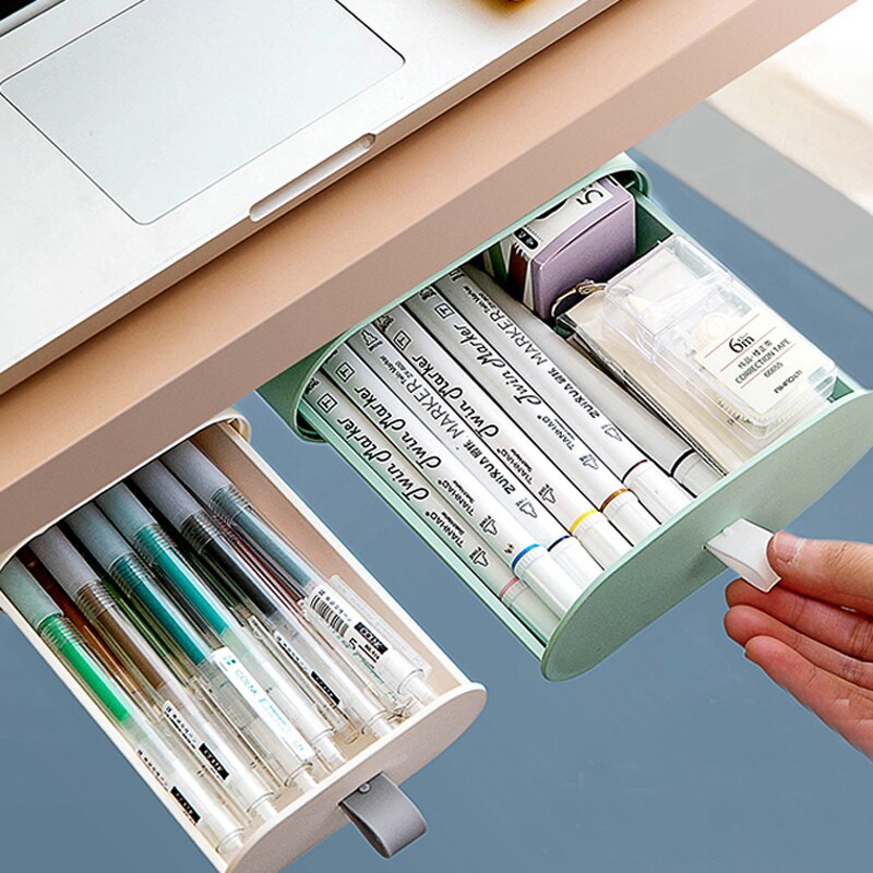 Declutter your work space with this ingenious under desk mini storage drawer. Simply secure to the underside of your desk, table top or coffee table using the included double sided adhesive patch and instantly have convenient storage for your cords, pens, remotes, jewellery or makeup. The options are endless.