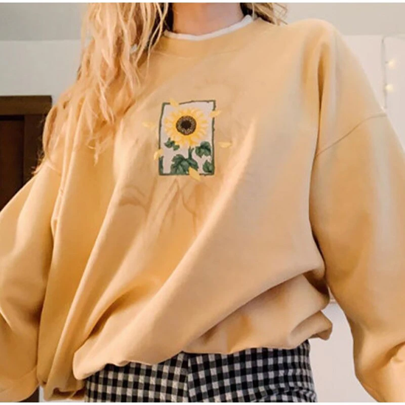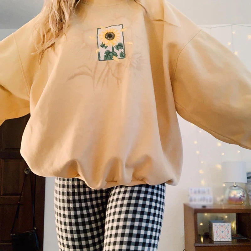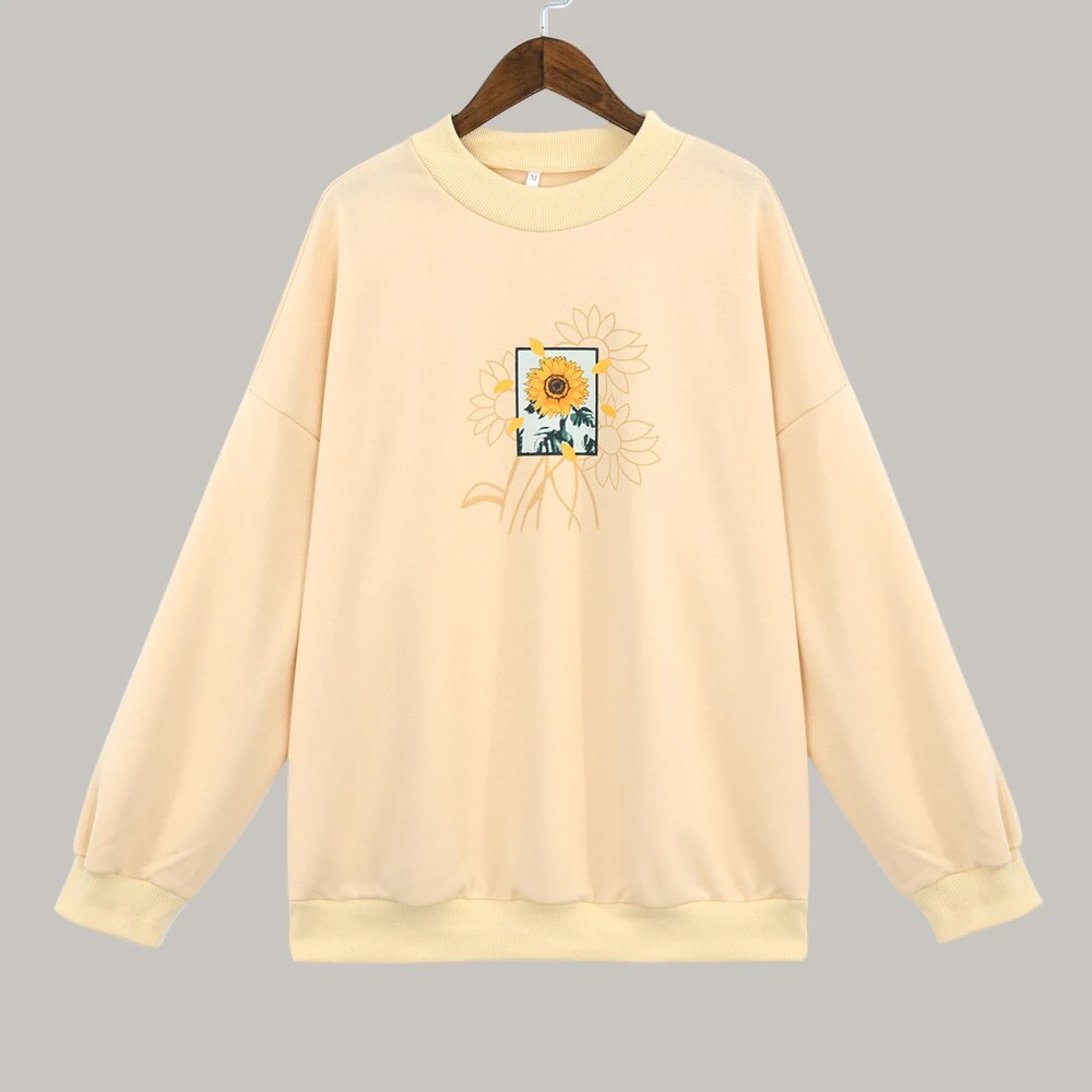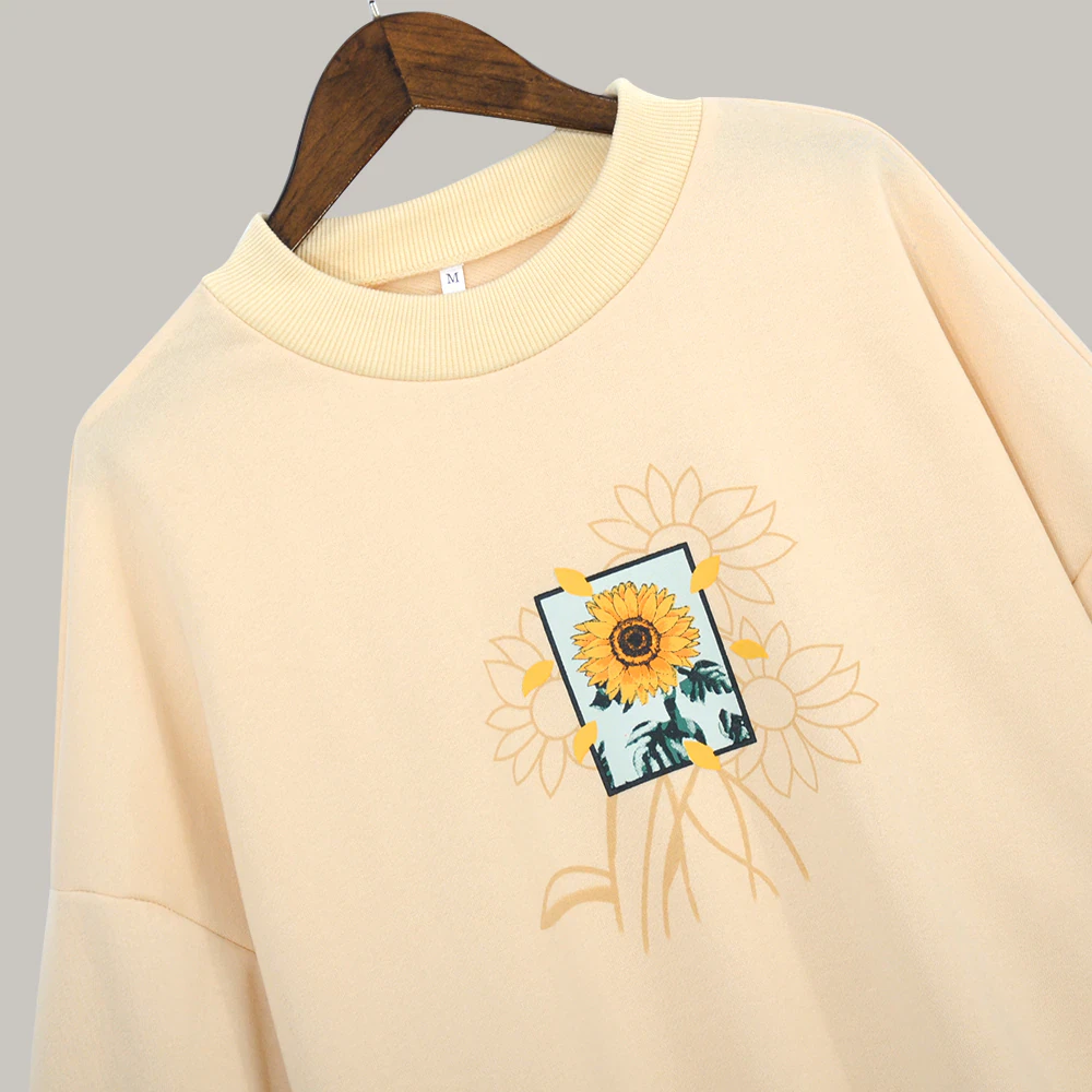 Need an oversized crew that goes with everything? You just found it! This neutral coloured sweat shirt featuring a sunflower print is a great staple piece for your wardrobe. It matches with a range of different patterned pants and skirts, so can be used all year round. Available in a range of sizes, you can choose the type of fit you want.