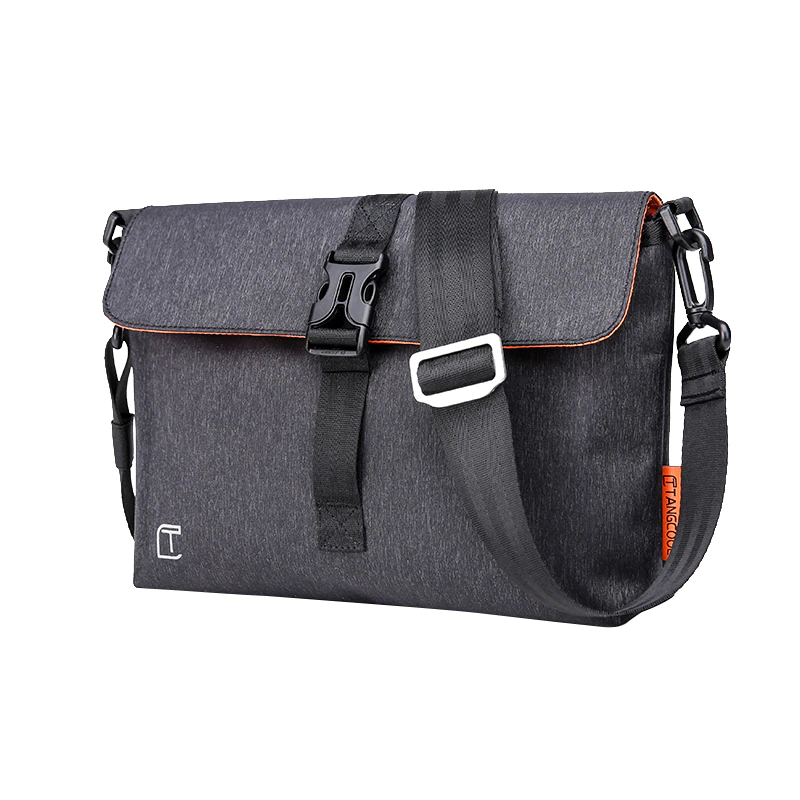 Perfect for school, work, or even as a carry-on when travelling. This messenger bag has an adjustable and detachable cross-body strap and fastens with a buckle for quick and easy access. Manufactured with double-sided, waterproof construction, you can rest assured that your valuables will stay dry while on-the-go. The exterior of the bag is grey, and interior a vibrant orange colour. Fits a 9.7inch iPad, books and other belongings. The shoulder strap is 142cm long, and the body of the bag is 28x7x19cm.