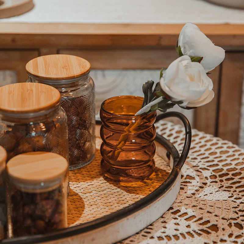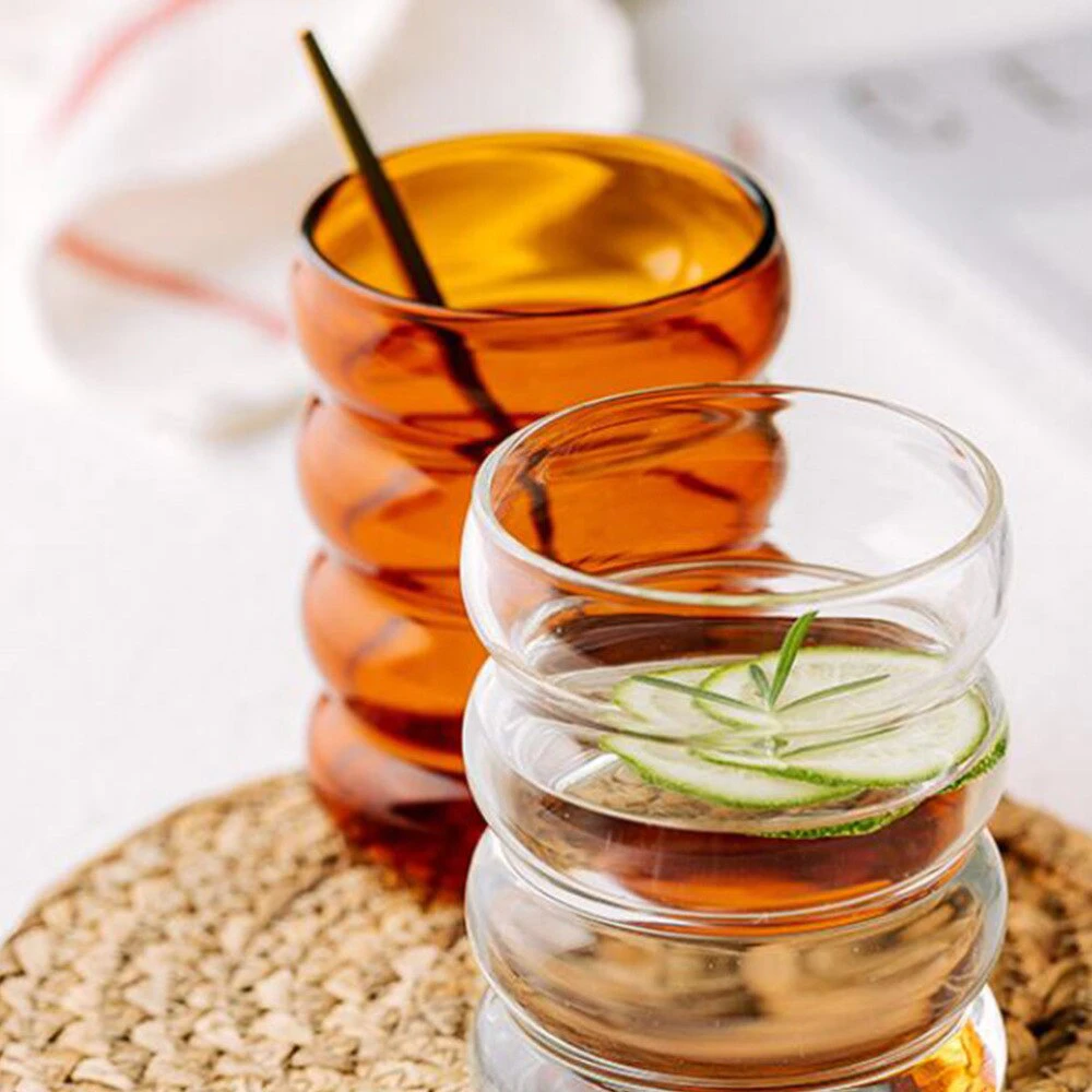 Serve up your favorite drink in these retro amber bubble glasses. Ripple design is trendy yet serves as an easy to hold grip. Heat and cold resistant. They can be placed in dishwasher for easy cleanup.