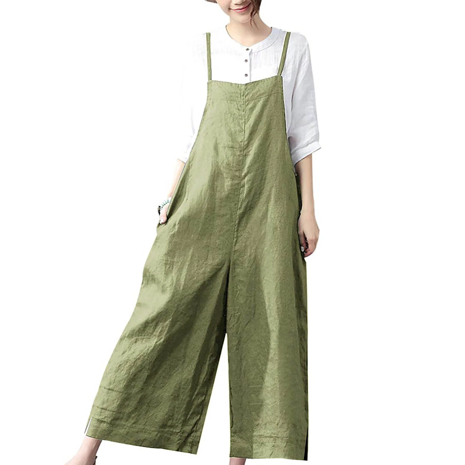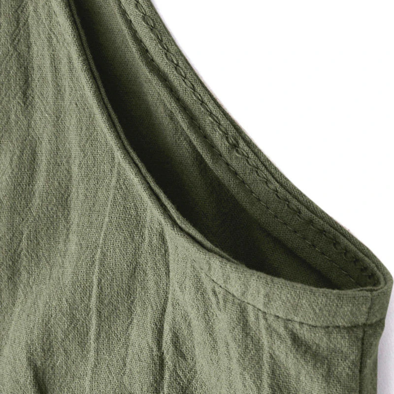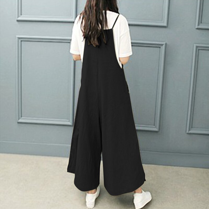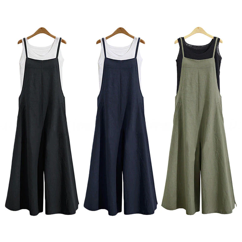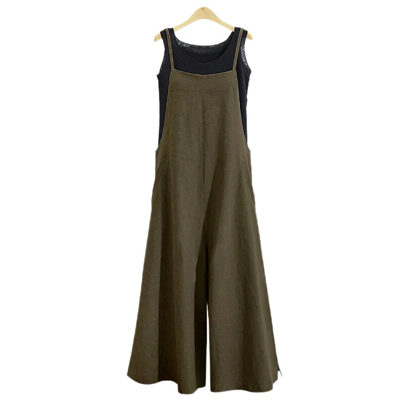 This breezy linen jumpsuit is perfect for a sunny day! Effortless and chic, this version has narrow, adjustable shoulder straps and two pockets in the front. Available in green, navy, and black to best suit your wardrobe.