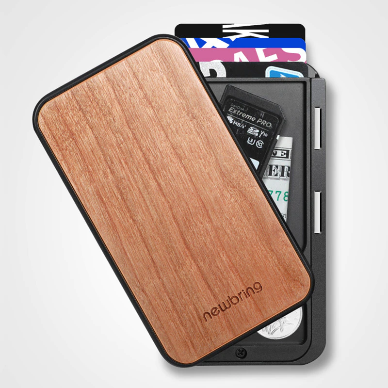 This sturdy wallet will keep your cards and cash safe! This case-style wallet blocks RFID interference while also having a layered design to organize all of your necessary cards while having room for cash and small objects. It even has a strap on the back side to carry extra cash! Available in a variety of wood finishes or a sleek carbon fibre one.