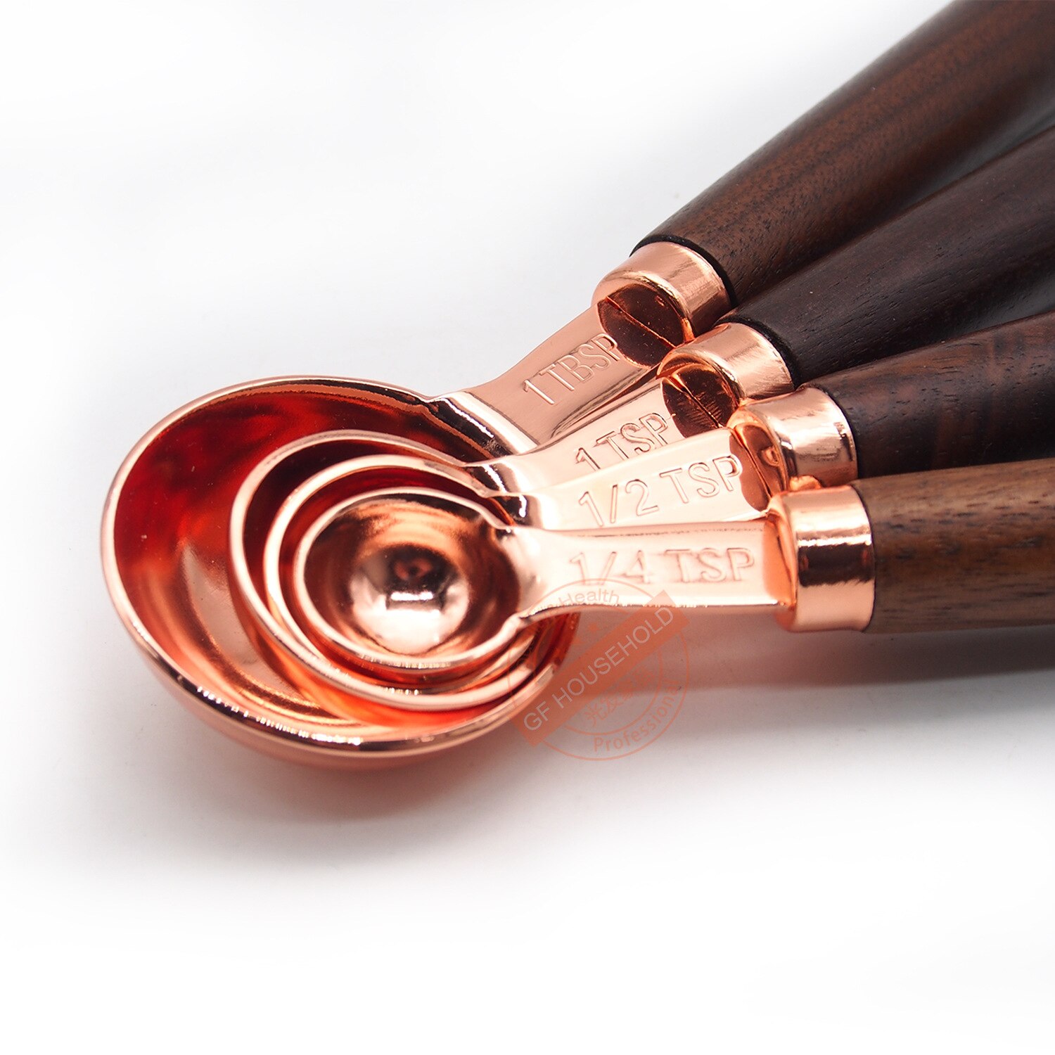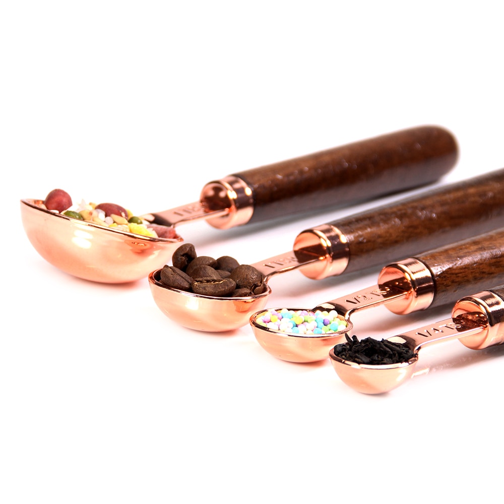 This set of 4 measuring spoons is a must-have for any home cook or baker. The spoons are made from durable copper-plated stainless steel and feature beautiful, natural wood handles. The set includes 1/4 teaspoon, 1/2 teaspoon, 1 teaspoon, and 1 tablespoon measurements, so you'll have everything you need to measure out ingredients for your favorite recipes. The spoons are easy to clean and store, and they'll add a touch of elegance to your kitchen tools collection. Whether you're a professional chef or a novice cook, these measuring spoons are a great addition to your kitchen.