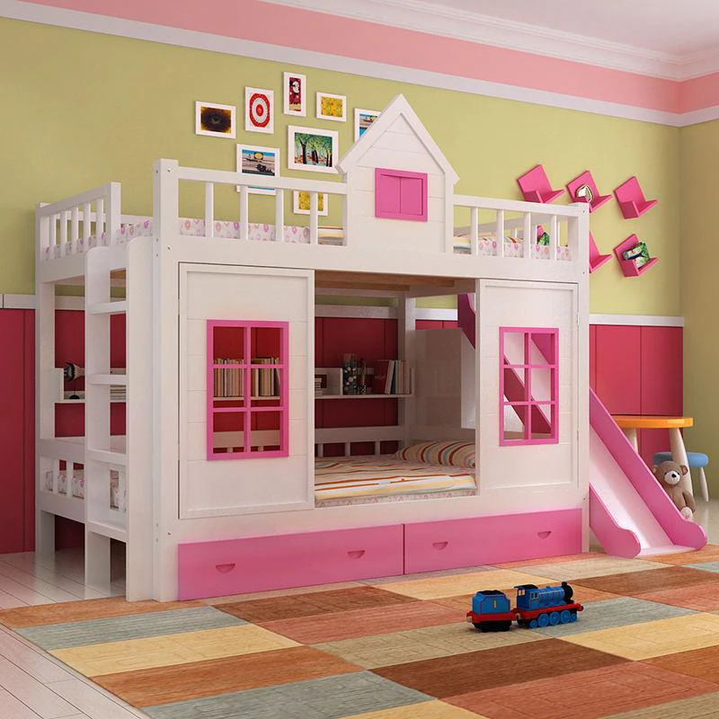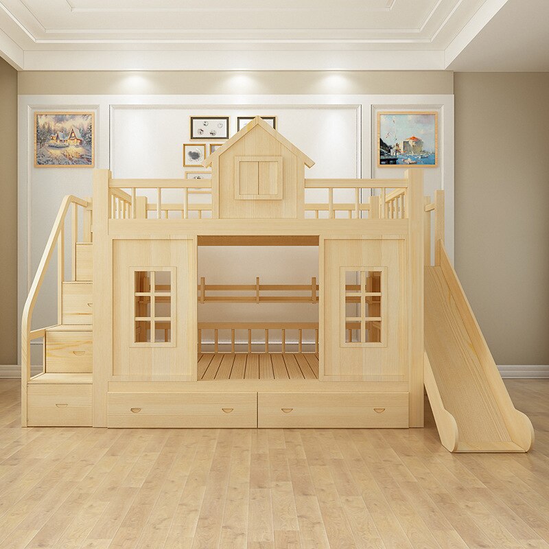 Make your child's dreams come true with this enchanting wooden bunk bed castle with slide. Made from sturdy and durable wood, this bunk bed is designed to provide a safe and comfortable sleeping space for two children. The castle-inspired design is sure to spark your child's imagination and make bedtime a magical experience. The attached slide adds an element of fun and excitement to the morning routine, while the built-in ladder ensures easy and safe access to the top bunk. With its charming design, durable construction, and practical features, this wooden bunk bed castle with slide is a magical addition to any child's bedroom.